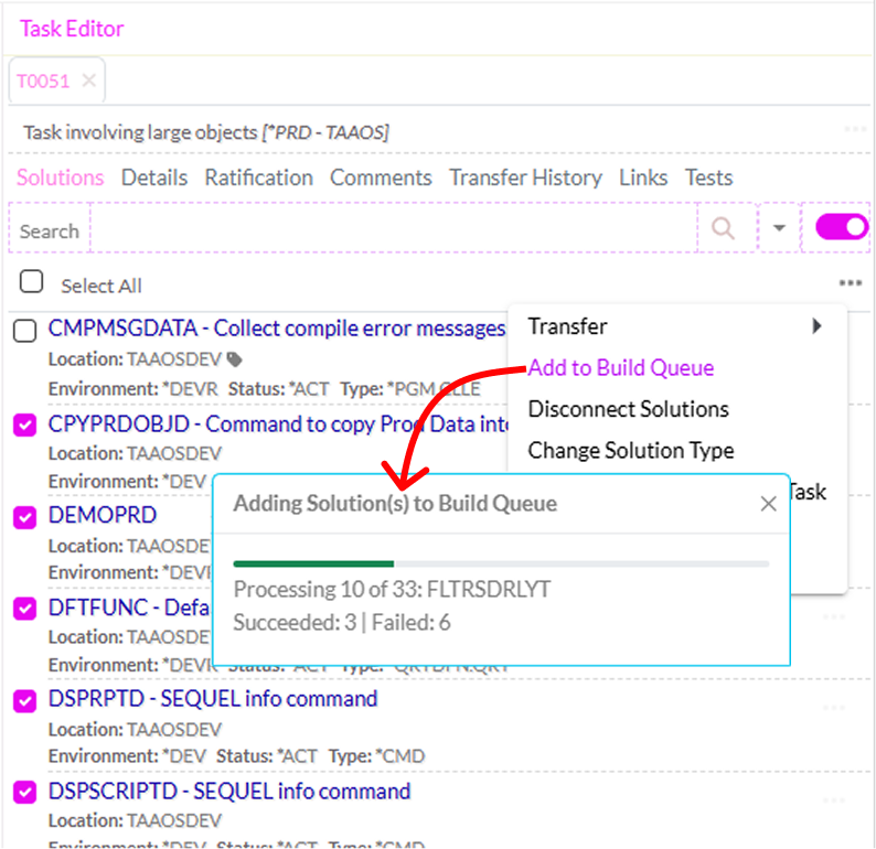 The multiselect for solutions includes a new option for Add to build queue. Progress is visible through a progress indicator, making it clear when a process is running and how far it has progressed.
